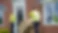 Two workers wearing reflective safety vests are seen carrying a box up a staircase